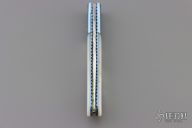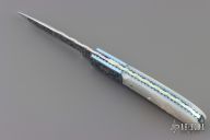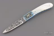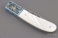This Linerlock features an engraved and fileworked drop point blade. The handle has an engraved titanium frame with mother-of-pearl inlays over file worked liners and backspacer. Excellent condition