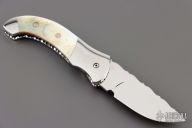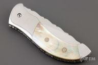 This linerlock by B Sharp features a mirror polished blade with fileworked spine with a single thumbstud. The handle has a stainless steel bolsters, pink pearl scales with mosaic pins, fileworked stainless steel liners and backspacer. Comes with a zippered case. Nice detent, lockup and blade seating. Excellent condition.