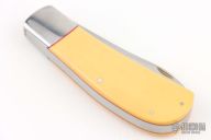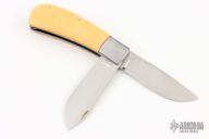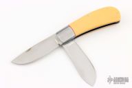 This slipjoint by Ray Cover features hand rub satin finished blades with a nail nicks. The handle has dovetailed stainless steel bolsters, Westinghouse paper micarta covers with red liners and nickel silver pins, stainless steel liners and springs. Has half-stops. Has a couple light scratches, otherwise excellent condition. Comes with a zippered case.