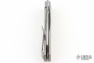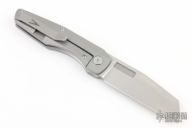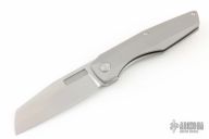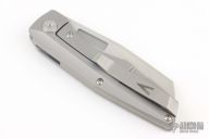 This Axon First Run Folder by Vero Engineering features a stonewashed blade with notched thumbrest and thumbhole. The handle has a bead blasted titanium frame with stainless steel lockface incert, tip up clip with hidden screws, titanium backspacer. Rides on bearings, nice detent, lockup and blade seating. Includes a padded zippered case and coa. Excellent Conditon.