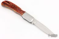 This Lockback from Dave Ricke features a hand rub satin finished clip point blade. The handle has stainless steel bolsters, jigged bone scales, stainless steel liners and fileworked backspacer. Includes a felt pouch. Has some light scratches, has some vertical blade play, otherwise good condition.