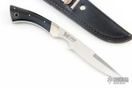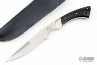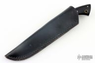 This dagger features a satin finished blade with a false top edge and notched thumbrest, .175" blade thickness and .871" blade depth, full tang construction. The handle has nickel silver bolsters and brown paper micarta scales with nickel silver pins. Great feel in the hand. Classic Samson design. Includes leather sheath. Has a couple light scuffs, otherwise excellent condition.