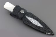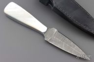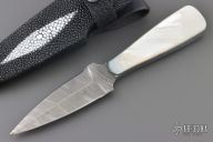 This Dagger by Jim Ort features a Damascus double edged blade with .175" blade stock and 1.297" blade depth, full tang construction. The handle has mother of pearl scales with black and white liners. Comes with a black leather sheath with stingray skin overlay. Has some light oxidation, otherwise excellent condition.