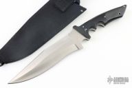 This Larry Battle Bowie by Paragon Cutlery Company features a bead blasted blade with sharpened top edge, .241" blade stock and 1.972" blade depth, full tang construction. The handle has black linen micarta scales with stainless steel pins and lanyard hole. Comes with original nylon sheath. Has some light scuffs and scratches excellent condition otherwise.