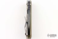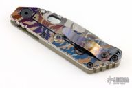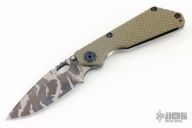 This SNG framelock folder by Mick Strider features a laser engraved tiger stripe blade and a dimple pattern green G-10 and flamed titanium frame and tip up titanium clip. Includes a "Lock Bar Stabilizer" for maximum reverse lock retention. Nice detent, lockup and blade seating. New Condition.  Comes with a velcro case and PDW patch.