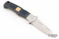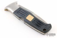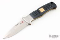 This AL MAR SERE Tactical Folding Knife features a satin finished spear point blade with a nail nick. The handle has stainless steel bolsters, textured black Neoprene with the RARE and limited GOLD Al Mar Chop inlaid on both sides, brass liners, stainless steel spring and backspacer, lanyard hole. Comes with original camo covered black leather sheath. Has a couple light scratches, otherwise excellent condition. Pre Production 152/200