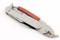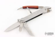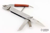 This 4x4 Tool Mate from Al Mark Knives features a drop point blade, a saw blade, nail file/pry bar combo and Phillips head screwdriver. Also includes pliers with a leather wrapped handle. Lanyard bail rotates over the plier handle to lock closed when not in use. Comes with nylon sheath. Has a couple light scratches, otherwise excellent condition.