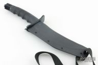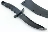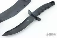This Warrior from Al Mar Knives features a black coated blade with serrated top edge, 7/32" blade stock and 1 1/2" blade depth, hidden tang construction. The handle has a stainless steel double guard, black rubberized handle, and a stainless steel butt. Comes with a kydex sheath with shoulder rig. Excellent condition.