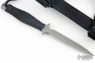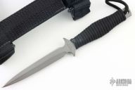 This knife by Barry Dawson features a bead blast finished dagger blade with .198" blade stock and .595" Blade depth.  The handle has black paracord wrapped handle. Comes with a nylon leg sheath. Has a couple light scuffs, excellent condition otherwise.