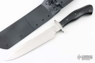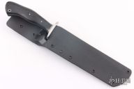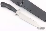 This knife by Sean McWilliams features a drop point blade with a satin finish and false top edge, .226" blade stock and 1.272" blade depth, hidden tang construction. The handle has a stainless steel guard, black linen micarta grip with black and stainless steel spacers. Comes with a kydex sheath. Has some light sheath scratches, otherwise excellent condition.