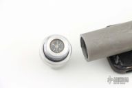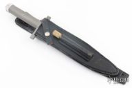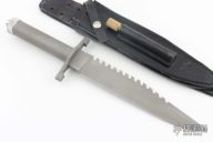 This knife has a 9" blade with 12 saw teeth (8 double split teeth and 4 single), .243" blade thickness and 1.450" blade depth. The stainless steel handle is waterproof and hollow. Cord wrap has been removed. The aluminum butt cap unscrews to reveal a compass, and allows you to use the hollow handle for storage. Comes with a black leather sheath with sharpening steel made by "Johnson Sheathery". Has some scuffs and light patina, otherwise excellent condition.