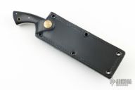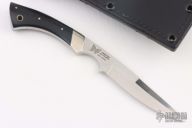 This dagger features a satin finished blade with a false top edge and notched thumbrest, .175" blade thickness and .871" blade depth, full tang construction. The handle has nickel silver bolsters and brown paper micarta scales with nickel silver pins. Great feel in the hand. Classic Samson design. Includes leather sheath. Has a couple light scuffs and scratches, otherwise excellent condition.