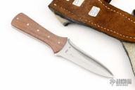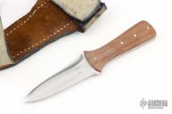 This boot dagger by TM Enos features a double edged satin finished blade with .137" blade stock and 1.12" blade depth, full tang construction. The handle has pinned wood scales with red liners. Comes with felt arm sheath. Marked 1004 dated 1981. Has some light scuffs and scratches, great condition otherwise.