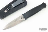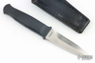 This Gerber Guardian is an R.W. Loveless design and features a satin finish double edged blade with .160" blade stock and .790" blade depth, hidden tang construction. Black aluminum textured handle with "Guardian" stamped on side. Knife includes a black leather sheath. #016878 on the blade. Has a couple light scuffs, excellent condition otherwise.