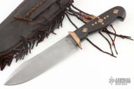 This Mountain Man Knife by Journeyman Smith Rich McDonald features a hand rub satin finished forged blade with a false top edge, .199" blade stock, 1.481" blade depth, hidden tang construction. The handle has a brass guard, cocobolo grip with brass and copper hardware. Comes with a rawhide leather sheath. Excellent condition.