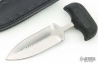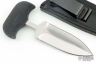 This Terminator Push Dagger by Cold Steel has a satin finished double edged blade with fullers and hidden tang, .186" blade stock, 1.324" depth. Handle is non-slip polymer. Excellent condition. Comes with a black leather sheath with clip. This was made in the 1980s