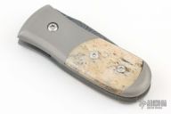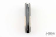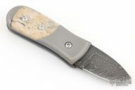 This Butter Bean by Chris English of Z Custom Knives features a Damacus drop point blade. The handle is comprised of a machined titanium frame with oosic inlays over a Damascus backspacer. Great lock up and action. Has a couple light scuffs, otherwise excellent condition.