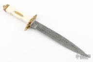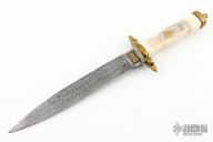 This Fighter by Chance Priest features a Damascus blade with .203" blade stock and 1.306" blade depth, hidden tang construction. The handle has a brass guard and butt, mammoth ivory grip with brass escutcheon. Comes with a zippered case. Excellent condition.