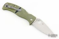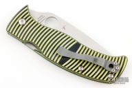 This Caribbean Pin by Spyderco features a satin finished fully serrated blade with thumbhole and a notched thumbrest, has LC200N blade steel. the handle has milled black/yellow G-10 scales, stainless steel liners, tip up bead blasted stainless steel clip, left/right reversible. Lanyard hole. Comes with original box and papers. New condition.