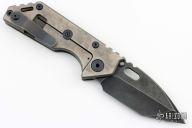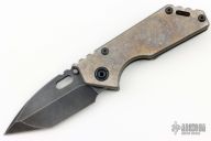 This 3/4 AR by Strider Knives features a black stonewashed blade with notched thumbrest and thumbhole. The handle has a custom finished titanium frame with a black stonewashed titanium tip up clip. Nice detent, lockup and blade seating.  Excellent condition. We think this was modified by Sean Campbell, but we are not positive.