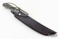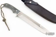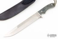 This Fighter by Mark Hazen features a satin finish recurved blade with false top edge and notched thumb ramp. 0.222" blade stock and 1.558" blade depth. The handle is comprised of contoured black micarta scales with pins over full tang construction. Lanyard hole in pommel. Includes leather sheath with belt loop. Has a couple light scuffs and scratches, excellent condition otherwise.