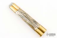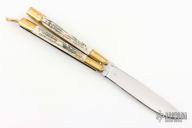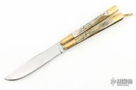 This balisong from the Philippines features a drop point blade with a satin finish. The handle has brass bolsters, front and rear and jigged bone scales, brass T-latch. Has scratches and patina, but that is normal for these, good condition.