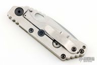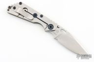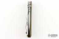 This SNG framelock folder features a stonewashed drop point blade with thumbhole and notched thumbrest. The handle has a green G-10 and a stonewashed titanium frame with titanium clip, tip up carry. Jimping on blade spine. The G-10 has a diagonal groove pattern. Nice lockup, detent, and blade seating. Excellent Condition.
