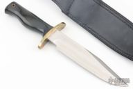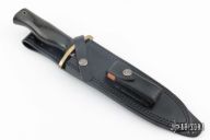 This Model 14 from Randall Made Knives features a satin finished spear point blade with .219" blade stock and 1.385" blade depth, full tang construction. The handle is comprised of a brass guard and black linen micarta handle. Comes with black leather sheath and stone. Has some light scuffs, and patina, excellent condition otherwise.