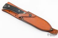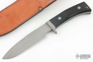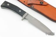 This knife from Robert Parrish features a bead blasted blade with sharpened top edge and a notched thumbrest, .250" blade stock and 1.293" blade depth, full tang construction. The handle is comprised of bead blasted steel guard and black linen micarta scales, has a lanyard hole. Comes with a brown leather sheath. Has a few light scuffs, otherwise excellent condition.