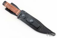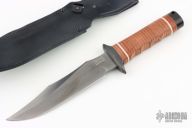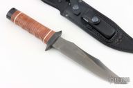 This Super SOG Bowie features a black bowie blade with false top edge, .261" blade stock and 1.504" blade depth, hidden tang construction. The handle is stacked leather with white spacers, and black steel double guard and butt cap with lanyard hole. Comes with black leather sheath with honing stone and original box. Excellent condition.