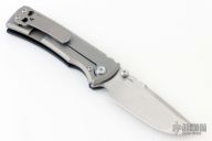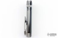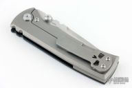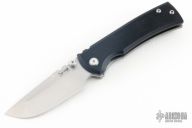 This Chaves Ultramar Redencion Drop Point features a satin finished blade with the Chaves logo, dual thumbstuds, and notched thumbrest. The handle is made up of a black G10 scale, tumbled titanium skull pocket clip (positioned for tip up carry), and a matching titanium backspacer. Has overtravel stop. Blade is centered when closed, and locks up with no play. Comes with box and additional clip. Excellent Condition.