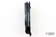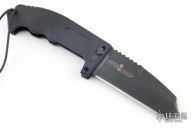 This 185° RAO Axis Lock Folder has a matte black finished N690 stainless steel spear point/ tanto blade (stamped CK06711 on A-side) with notched thumb rest and multiple grind planes. This knife features a removable threaded pin that prevents deploying the blade when stored and can fix the knife in the open position. Handle is black aluminum with lanyard. Comes with sheath and sharpener. Has a couple light scuffs and scratches, otherwise Excellent Condition.