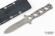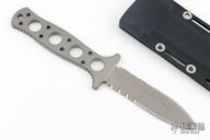 This Boker Magnum Titanium Dive knife features a partially serrated, chisel tip blade with sharpened top edge, micro serrated edge, full tang construction and thickness of .245" and depth of .970". Knife comes with a kydex sheath. Has a couple light scratches, otherwise excellent condition.
