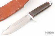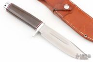 This knife by Bark River features a satin finished clip point blade with false top edge and fullers, .214" blade stock and 1.32" blade depth, hidden tang construction. The handle has aluminum guard and aluminum butt, green micarta grip with red, white, and black spacers. Comes with original leather belt sheath. Has a couple light scuffs and scratches, excellent condition otherwise.