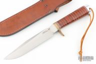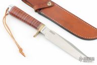 This Model 1-7 by Blackjack Knives features a satin finished blade with a false top edge, .217" black stock and 1.190" blade depth, hidden tang construction. The handle has a brass guard, stacked leather grip with red/white/black spacers, aluminum butt. Comes with brown leather sheath, original box andpapers. Excellent condition.