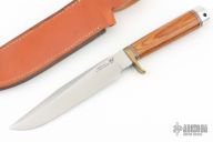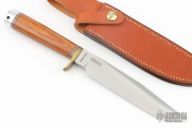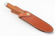 This Model 1-7 by Blackjack Knives features a satin finished blade with a false top edge, .215" black stock and 1.190" blade depth, hidden tang construction. The handle has a brass guard, dymondwood grip with red/white/black spacers, aluminum butt. Comes with brown leather sheath and original box. Excellent condition.