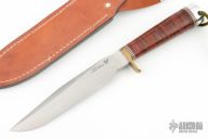 This Model 1-7 by Blackjack Knives features a satin finished blade with a false top edge, .215" black stock and 1.190" blade depth, hidden tang construction. The handle has a brass guard, stacked leather grip with red/white/black spacers, aluminum butt. Comes with brown leather sheath and original box and papers. Excellent condition.