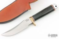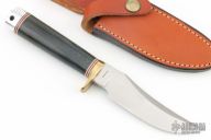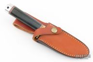 This Classic Blades Stalker from Blackjack Knives features a satin finish upswept blade with swedge, .218" blade stock and 1.167" blade depth, hidden tang construction. The handle is comprised of a brass single guard with red, white and black spacers and black linen micarta grip, aluminum butt. Includes a brown leather sheath with belt loop, original box and papers. Excellent condition.
