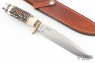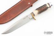 This Model 1-7 by Blackjack Knives features a satin finished blade with a false top edge, .215" black stock and 1.190" blade depth, hidden tang construction. The handle has a brass guard, stag grip with red/white/black spacers, aluminum butt. Comes with brown leather sheath and original box and papers. Excellent condition.