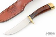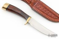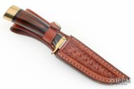This knife by Browning Knives features a polished blade with .108" blade stock and .944" blade depth, hidden tang construction. The handle has a brass guard and butt, dymondwood grip with black/grey spacers. Comes with a hand tooled brown leather sheath, original box and papers. Has some light scratches, otherwise excellent condition.