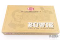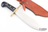 This vintage Bowie from Case Knives features an mirror polished clip point blade with false top edge, .171" blade stock and 2" blade depth, hidden tang construction. The handle is comprised of brass double guard with a black composite grip. Includes a brown leather sheath and original box. Excellent Condition.