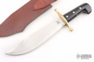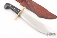 This vintage Bowie from Case Knives features an mirror polished clip point blade with false top edge, .171" blade stock and 2" blade depth, hidden tang construction. The handle is comprised of brass double guard with a black composite grip. Includes a brown leather sheath and original box and papers. Excellent Condition.