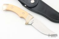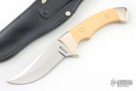 This Samurai by CAMIII features a mirror polished up-swept blade with a false top edge, .155" blade stock and 1.337" blade depth, full tapered tang construction. The handle has nickel silver bolsters and butt cap, yellow paper micarta scales with red liners. Comes with a black leather sheath and original wooden display box. Excellent condition. #076