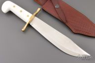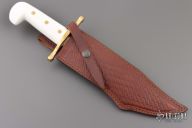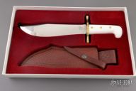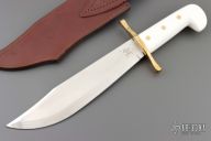 This vintage Bowie from Case Knives features an mirror polished clip point blade with false top edge, .171" blade stock and 2" blade depth, hidden tang construction. The handle is comprised of brass double guard with a white composite grip. Includes a brown leather sheath and original box. Excellent Condition.