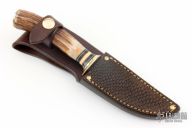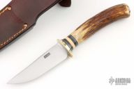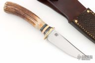 This Trout and Deer by Jim Behring features a satin finished 1085 convex ground blade with 0.106" blade stock and .996" blade depth, hidden tang construction. The handle has a brass guard, 120 year old stag, with black/yellow/red spacers and brass buttcap. Comes with a brown leather sheath with beaver tail panel. New from maker!