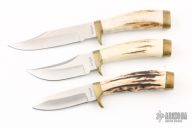This set of knives from Kershaw were made by Dan Harrison and are all numbered 0735. They have satin finished blades with false top edges, .185" blade stock, hidden tang construction. The handle has a brass guard and butt with a stag grip. All three are hand signed by Dan Harrison and #0735. Comes with original case. Excellent condition.