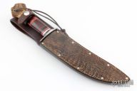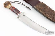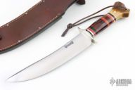 This Fighter by Jim Behring features a satin finished convex ground blade with 0.225" blade stock and 1.583" blade depth, hidden tang construction. The handle has a nickel silver guard, stacked horse hide leather, with black/red/yellow spacers, pinned crotch stag butt with lanyard hole. Comes with a brown leather sheath with premium shark panel. New from maker!