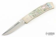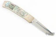 This Interframe Lockback from Frank Centofante features a hand rub satin finish blade with nail nick. The handle is comprised of a nickel silver frame with abalone inlays over stainless steel and micarta backspacer. Has some patina, and a couple light scratches. Excellent condition.