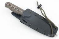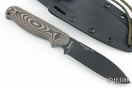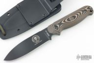 This Laser Strike from ESEE Knives features a drop point black coated blade with notched thumbrest, .194" blade stock and 1.365" blade depth, full tang construction. The handle has black/brown G-10 scales with bow drill divot on the presentation side scale. Scales are removeable using the washer attached to the sheath. Inside the handle there is a small storage compartment. Includes kydex sheath with belt clip. Excellent condition.