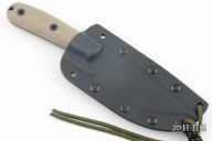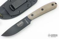 The ESEE-4HM fixed blade knife features a black finished 1095 steel blade with a plain cutting edge, canvas Micarta scales and a traditional handle design with a smooth rounded pommel. This ESEE model includes a genuine leather sheath with a belt loop. ESEE knives are made from high carbon 1095 steel. And while 1095 is a top choice for professional cutlery designed for hard use, it will rust and stain if not properly cared for, especially on the cutting edge and around the laser engraving. It is the user's responsibility to keep the blades properly lubricated and cleaned. Comes with original box, papers and kydex sheath. Excellent condition.